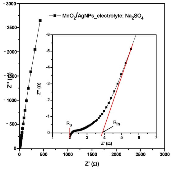 The EIS measurement of the cell with MnO2/AgNP using the Na+ form of the Aquivion electrolyte membrane was conducted additionally. The Nyquist plot (Figure 12) is typical for an electrochemical supercapacitor. The inset figure represents the zoomed high-frequency region. The hinted depressed semicircle at high frequencies is a superposition of the semicircles due to the pore resistance Rp and charge transfer resistance Rct of the two electrodes with a total value of 0.45 Ω. The high frequency (left) intersection of the semicircle with the Z’ axis gives the value of the series resistance (Rs = 2 Ω) and is usually due to the resistance of the electrolyte as well as the electrical contacts. In the middle and low frequencies, the Nyquist diagram appears as straight lines with low (<45°) and high (>80°) slopes that describe the diffusion process and capacitive behavior, respectively. The intersection of the continuation of the capacitive line with the abscissa gives the internal resistance of the supercapacitor Rint = RS + RP + Rct + RD = 3.9 ohms (RD is the diffusion resistance). This resistance is comparable to that of symmetrical carbon supercapacitors.