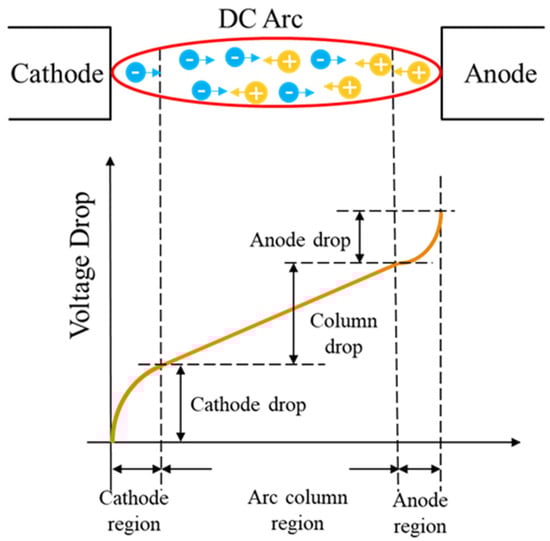 The direct current arc can be divided into three parts: the cathode region, the arc column region, and the anode region [31], as shown in Figure 1. In typical situations, the cathode region and the anode region, collectively referred to as the arc column region, complete the transition from a solid with constant electrical conductivity to a gas with variable electrical conductivity. This region has a relatively short length, typically ranging from 0.02 to 0.1 mm. The cathode process is crucial to the generation of the arc, where electron emission from the cathode leads to the accumulation of positive charges. A high electric field strength is a necessary condition for arc generation. The influence of the anode on the arc process is relatively small; it receives electrons from the arc column, but the electrons often cannot fill the entire space of the anode region, resulting in a decrease in the electric field strength compared to the cathode region [30]. The arc column region, located between the cathode and anode regions, is a collectively electrically neutral high-temperature plasma, approximately cylindrical in shape. The voltage of the arc column region increases with the lengthening of the arc [32]. The electric field strength in the arc column region is influenced by the electrode materials, gas type, and current magnitude, but overall, it exhibits a uniform distribution and is lower than the electric field strength in the arc column region [33].