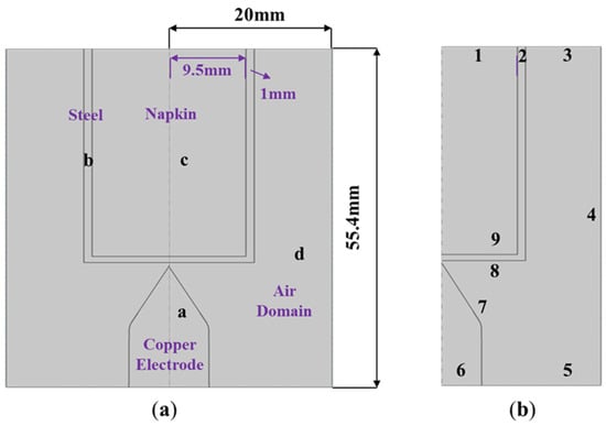 Arc simulation model for batteries under an air gap of 0.4 mm: (a) geometric model; and (b) model boundaries.
