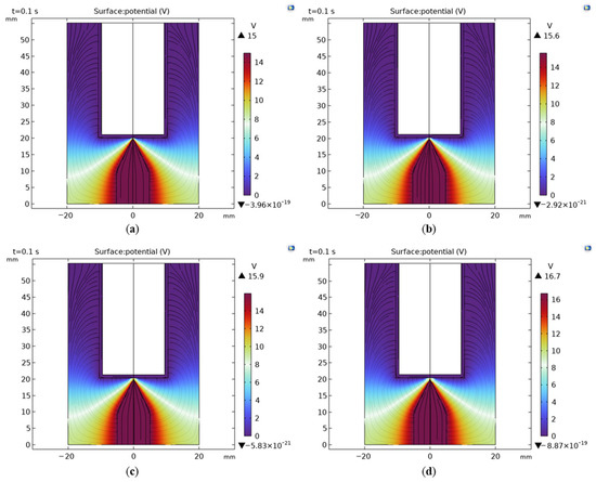 Simulation results of the voltage field when the arc occurred under different air clearances: (a) 0.1 mm; (b) 0.2 mm; (c) 0.3 mm; and (d) 0.4 mm, with a circuit voltage of 200 V and a circuit current of 10 A.
