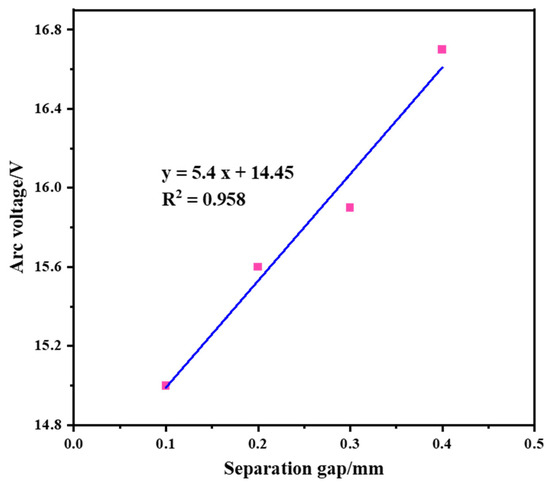 At a power supply voltage of 200 V, circuit current of 10 A, and gap distances of 0.1 mm, 0.2 mm, 0.3 mm, and 0.4 mm, the arc voltages were measured as 15 V, 15.6 V, 15.9 V, and 16.7 V, respectively. These values are in good agreement with the fitted curve of the arc voltage and distance in the experiment, represented by y = 5.65x + 14.34, with errors within 0.15 V, demonstrating conformity with the evolving pattern of the arc.