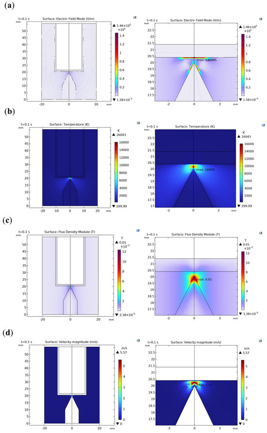 Under the condition of 200 V + 10 A, the simulation results of the electric field, temperature field, magnetic field, and flow field are shown in Figure 5. In Figure 5a, the maximum value of the electric field is 1.46 × 105 V/m. The right figure is an enlarged view of the electric field in the arc initiation region. It can be observed that the maximum electric field intensity is near the cathode. The cathode process is crucial for arc generation, as the emission of electrons from the cathode leads to the accumulation of positive charges, and a high electric field intensity is a necessary condition for arc generation. The influence of the anode on the arc process is relatively small. It accepts electrons from the arc column, and the electric field intensity is relatively reduced compared to the cathode area. The electric field intensity in the arc column region generally exhibits a uniform distribution and is lower than the electric field intensity in the cathode region. In Figure 5b, the maximum temperature of the arc is 16,043 K, and the highest temperature in the system is located at the center of the electrode gap. The temperature of the arc decreases in an arc shape toward the surroundings. Some heat is transferred to the surface of the copper electrode and the battery through thermal conduction, while the remaining majority of the heat is dissipated into the air, maintaining a higher temperature in the surrounding air area. In Figure 5c, the maximum magnetic flux density is 0.01 T at the tip of the copper electrode. In Figure 5d, the maximum flow velocity is 5.57 m/s, located at the center of the electrode gap.