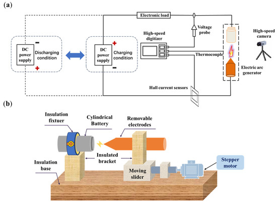 In order to investigate the generation of arcs in battery systems and their impact on battery safety performance, we established an experimental platform simulating arc occurrence. As shown in Figure 6, the main circuit section, depicted in Figure 6a, comprises an adjustable DC power supply, Hall current sensor, arc generator, electronic load, high-speed data acquisition instrument, voltage probe, thermocouple, high-speed camera, and stroke control module. Within this setup, the DC power supply, Hall current sensor, arc generator, and electronic load are connected in series to form a circuit. To ensure the safety of the experiment, a variable DC power supply is used instead of an energy storage battery pack. The DC power supply can provide a maximum variable DC voltage of 1500 V, with an output voltage error within 0.2%. The adjustable load is used to regulate the current magnitude in the main circuit and protect the circuit’s safety, with an error within 0.2%. A Hall effect current sensor is employed to measure the changes in current in the circuit, with a maximum of 25 A and an error within 0.8%. The arc voltage (Uarc), circuit current (Idc), temperature, and other parameters are recorded by an online high-speed data acquisition system, with a maximum sampling rate of 10 MS/s. A high-speed camera with a maximum frame rate of 10.00 frames/s is employed to observe the evolution of the arc behavior from the main view direction.