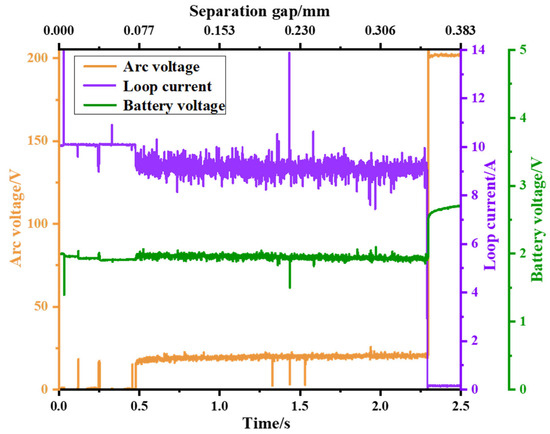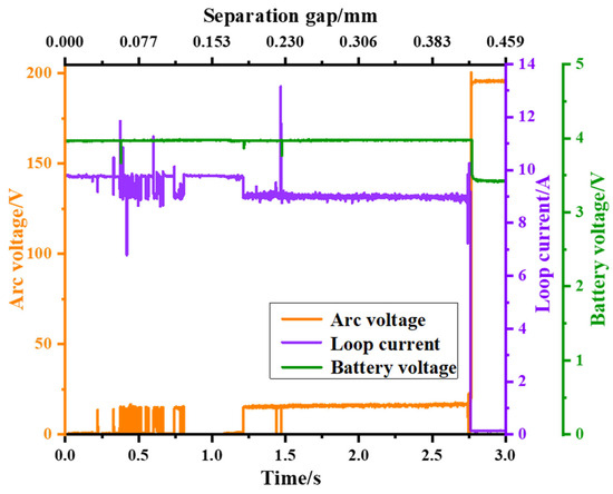 Figure 7 shows the waveform of the arc voltage, circuit current, and battery voltage during the arc occurrence and extinction when the power supply voltage is 200 V and the charging circuit current is 10 A (approximately 2 C). From the figure, it can be observed that when the arc fault does not occur, the copper electrode of the arc generator and the battery are closed, acting as a conductor, and the circuit current remains constant at 9.7 A, the arc voltage is 0 V, and the battery voltage is 4.0 V. Then, when the copper electrode moves backward at a speed of 0.153 mm/s, sparks are generated first. There are upward and downward spikes in the arc voltage waveform and the circuit current waveform, indicating an unstable discharge phase with a duration of approximately 1.2 s. With the increase in the gap, it enters the arc discharge phase, where a stable arc is generated, and the arc is equivalent to a dynamic resistor. The arc voltage jumps from 0 V to the arc starting voltage, approximately 15 V. Subsequently, the arc voltage slowly increases over time, reaching 18 V. During this phase, bright sparks can be observed, lasting for 1.6 s. As the gap continues to increase, the energy in the gap becomes insufficient to maintain the stable combustion of the arc, and the arc extinguishes. During the arc extinction process, there is an overvoltage generated. Subsequently, the arc voltage becomes the power supply voltage, and the circuit current becomes 0 A. Due to the circuit being open, the power supply voltage no longer charges the battery. After the arc extinguishes, there is a decline in the battery voltage, dropping from 4.0 V to 3.4 V.