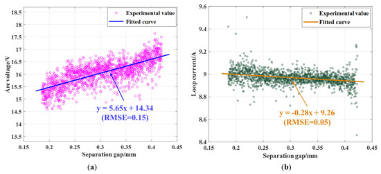 The root mean square error (RMSE) between the actual values and the fitted curve is 0.15 V for the fitted curve of the arc voltage and distance, as shown in Figure 8a. Similarly, for the fitted curve of the charging circuit current and distance, as illustrated in Figure 8b, the equation y = −0.28x + 9.26 is satisfied, and the RMSE between the actual values and the fitted curve is 0.05 A.