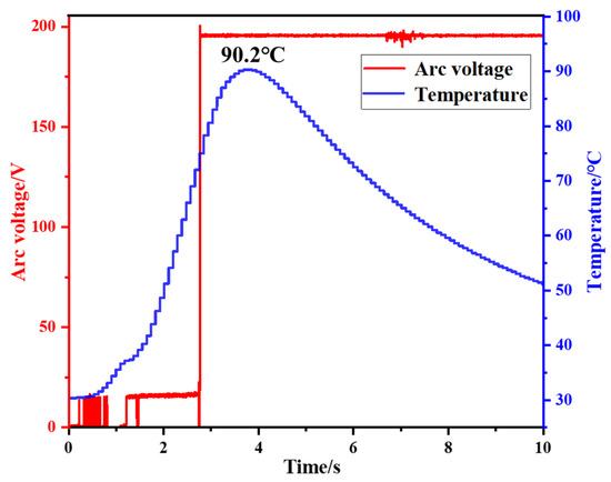 The variation of the arc voltage and the measured temperature at the position of 6 mm away from the arc generation point on the surface of the battery’s negative electrode.