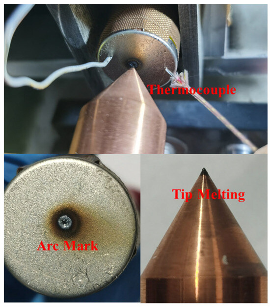 The waveform of the arc voltage and the temperature variation at the position 6 mm away from the arc initiation point on the surface of the battery negative electrode are shown in Figure 9. From the figure, it can be observed that the initial temperature of the battery surface is 25 °C. When the arc occurs, the temperature on the battery surface begins to rise, and with the continuous duration of the arc, the temperature on the surface of the battery’s negative electrode keeps increasing. The arc lasts for a total of 2.8 s, and the temperature at the position 6 mm away from the arc initiation point on the negative electrode surface reaches its peak temperature of 90.2 °C at 3.8 s. Since the thermocouple is positioned 6 mm away from the arc initiation point, there is a 1 s heat transfer process. In locations closer to the negative electrode surface, the temperature is higher. After the arc extinguishes, with no heat source, the temperature gradually decreases. The placement of the thermocouple and the phenomena on the battery’s negative electrode surface and the copper electrode tip after the arc are marked in Figure 10. After the arc action, there is a formation of holes on the surface of the battery’s negative electrode. The formation of these holes causes the arc to lose its anode, accelerating the arc-extinguishing process. There is a high-temperature burn mark at the tip of the copper electrode (the tip of the copper electrode is in a molten state, and the arc temperature reaches the melting point of copper).