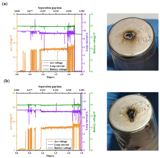 Figure 11a,b depict the waveforms of the arc voltage, circuit current, and battery voltage, as well as the wreckage of the battery, at a charging current of 10 A and power supply voltages of 300 V and 400 V, respectively. From Figure 11, it can be observed that, at power supply voltages of 300 V and 400 V, the arc voltage is around 15 V, and the arcs last for approximately 2.2 s and 2.5 s, respectively. In comparison to the 200 V power supply condition, there is more pronounced oscillation in both the arc voltage and circuit current waveforms during the arc initiation and extinction phases. However, with the increase in the power supply voltage, the duration of the arcs decreases by 0.6 s and 0.3 s, respectively. After the arc, not only are there holes formed on the negative surface of the battery, but there is also electrolyte leakage. Since there are holes formed on the surface of the battery after the arc occurs, it indicates that the temperature of the arc acting on the surface of the battery is higher than the melting point of the steel on the surface of the battery (1500 °C), and the temperature of the arc itself is much higher than 1500 °C. With the increase in the power supply voltage, the burning of the copper electrode tip becomes more intense. At a power supply voltage of 400 V, there is the appearance of melted beads on the copper electrode.