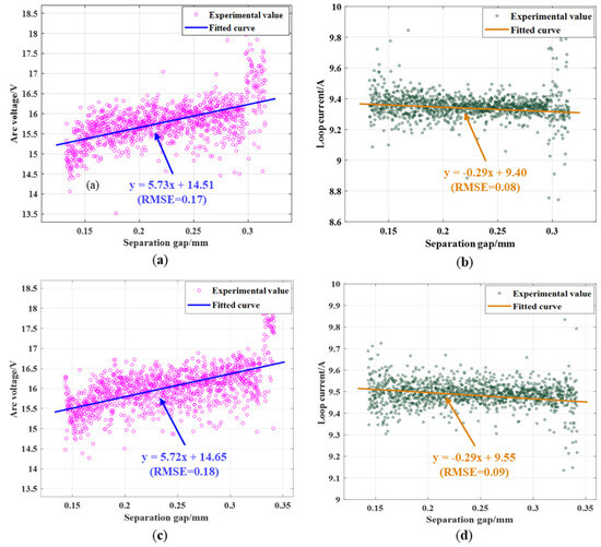 Under the conditions of 300 V and 400 V with a 10 A charging current, any set of experimental data was chosen for data fitting, as shown in Figure 12. For the 300 V and 10 A conditions, the fitting curve for the arc voltage versus distance conforms to the equation y = 5.73x + 14.51, with an RMSE of 0.17 V, as depicted in Figure 12a. The fitted curve for the charging circuit current versus distance satisfies the equation y = −0.29x + 9.4, with an RMSE of 0.08 A, as illustrated in Figure 12b. In the scenario of 400 V and 10 A, the fitted curves for both the arc voltage versus distance (y = 5.72x + 14.61, RMSE = 0.18 V, as shown in Figure 12c) and the charging circuit current versus distance (y = −0.29x + 9.55), RMSE = 0.09 A, as shown in Figure 12d) are consistent. Therefore, in the charging condition and under different levels of power supply voltage, the arc voltage and charging circuit current exhibit a similar evolutionary pattern with the separation distance, demonstrating a linear relationship.