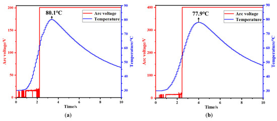 The arc voltage waveform and the temperature variation waveform at the distance of 6 mm from the occurrence point of the arc on the negative electrode surface are shown in Figure 13a,b. As seen in Figure 13a, the highest temperature at 6 mm from the arc occurrence point on the negative electrode surface is 80.1 °C. Compared to the power supply voltage of 200 V, although the arc duration only decreased by 0.3 s, the surface temperature of the battery decreased by 10.1 °C. As shown in Figure 13b, the highest temperature is 77.9 °C, and the surface temperature of the battery decreased by 12.2 °C.