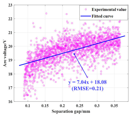 As shown in Figure 8a, the fitting curve for the arc voltage and separation distance satisfies the equation: y = 5.65x + 14.34. According to the root mean square error formula: