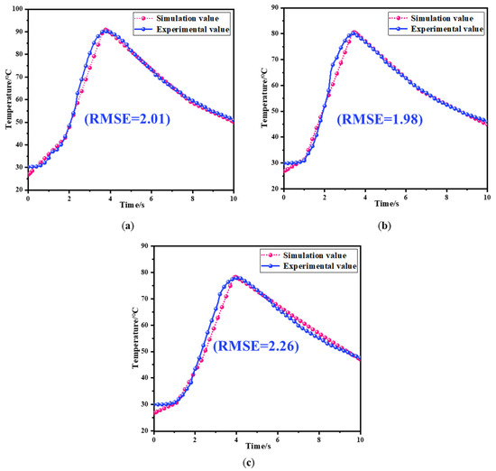 The simulated and experimental temperature variation waveforms at a distance of 6 mm from the arc initiation position under different voltage levels are presented in Figure 17. From the graph, it can be observed that the simulated values and experimental values of the temperature are generally consistent at different power supply voltage levels. The root mean square errors (RMSEs) are 2.01 °C, 1.98 °C, and 2.26 °C, respectively. Comparing with the experimental maximum temperatures of 90.2 °C, 80.1 °C, and 77.9 °C, the errors are 2.2%, 2.5%, and 2.9%, respectively. The temperature errors between the simulation and experiment are all below 3% at different power supply voltage levels, indicating a good fitting effect. Due to the excessively high temperature of the arc, which cannot be measured by existing instruments, the accuracy of the simulated arc temperature is demonstrated by the temperature error being less than 3% when compared with the experimental measurements on the battery’s negative electrode surface at a distance of 6 mm from the arc initiation position.
