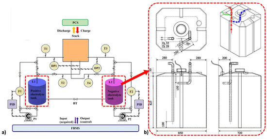 (a) IS-VRFB scheme with stack, tanks, hydraulic piping, and instrumentation, including electrolyte flow-meters F1 and F2, electrolyte level sensors L1 and L2, electrolyte differential pressure gauges DP1 and DP2, electrolyte input temperature T1 and T3, and output temperatures T2 and T4 gauges. P1 and P2 are the electrolyte pumps, FBMS the Flow Battery Management System, and PCS the Power Conditioning System. (b) Tank tech drawing with outlet flow (red arrows), and inlet flow (blue).