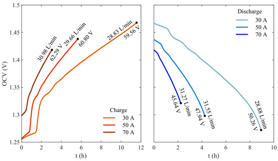 This section presents the experimental results obtained from the IS-VRFB facility. The experiments were carried out at stack currents of 30 A, 50 A, and 70 A, with the flow factor maintained at a constant value of α = 8. This setting is considered representative of common operational protocols for IS-VRFBs, because yielded performance results are comparable to the optimal constant value of α = 7.5 reported by Tang et al. [44] in their study conducted on a 40-cell stack. During the tests, the flow rate Q varied according to Equation (1), depending on the measured stack current I and SoC values. It must be noted that charging and discharging at full battery power would last about 3 h, given the battery capacity (2 × 550 L of electrolytes providing 27 kWh). Indeed, tests were performed at lower powers and currents, so that much longer durations were experimented. The pumps were feedback-controlled to provide electrolyte dynamic flow rate Q consistent with Equation (1). The resulting flow rates are reported in Table 2.