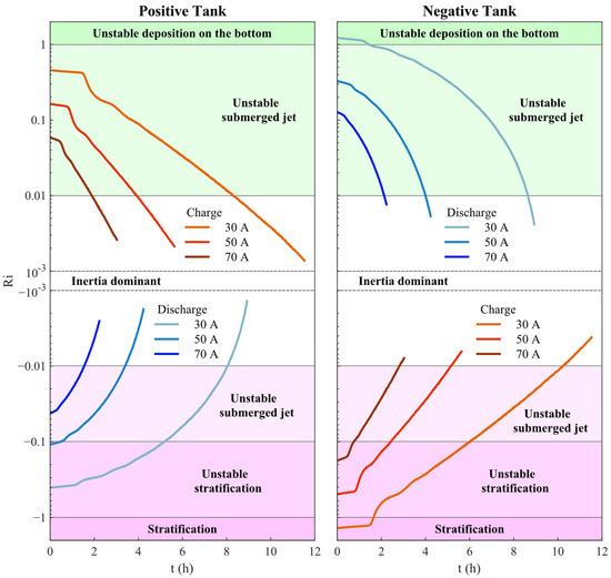 A more detailed analysis regarding flow estimation for each tank and case uses of the Richardson number Ri of Equation (7) is shown. Figure 3 shows Ri number evolution in the positive (left) and negative (right) tanks for all cases, with annotations about estimations of the dominating fluid dynamics in different Ri ranges. As and during charge and opposite variations occurred during discharge, the tanks exhibited opposite flows. During charge (red lines), the positive tank presented unstable submerged jets, as the Ri values remain lower in the Ri ≈ 1 condition, being more influenced by the buoyancy at 30 A (Ri ≈ 0.45), with inertia playing a major role at 70 A (Ri ≈ 0.06). In all three cases at different I, a high mixing was expected, as the Ri values were not high enough to induce buoyancy and, since , to generate significant depositions at the bottom of the tanks. According to Equation (7), the higher I, the stronger the buoyancy effects, but due to the constant α operations, Q increases linearly with I, so the Ri number decreases allowing the charged electrolyte to flow faster toward the tank, increasing jet momentum and therefore the convective mixing. The charged positive electrolyte showed a stronger mixing in all cases, as Ri+ consistently fell within a range influenced by the jet momentum. Conversely, the negative tank (right) showed a higher dependence on buoyancy, leading to stratifications during the plateau phases. These stratifications conformed expectations from the estimations described above. Stratification was more pronounced at 30 A (Ri ≈ −1), where the charged electrolyte filled the entire tank, less prominent at 50 A (Ri ≈ −0.5), where a piston flow filled the tank more rapidly, and even less significant at 70 A (Ri ≈ −0.2), where an unstable flow filled the tank. The plateau originated from the negative tank, where the charged electrolyte tended to stay at the top and only after a time tPF the piston flow effect allowed it to arrive down at the outlet and thereafter to reach the OCV cell. Then, the OCV cell received the charged electrolyte, resulting in the SoC and in a higher Q, as we maintained a constant α. From that time on, Ri values decreased leading to a flow more dominated by the inertia, although at 30 A two more steps appeared (because Ri values did not decrease as fast as in the other cases).
