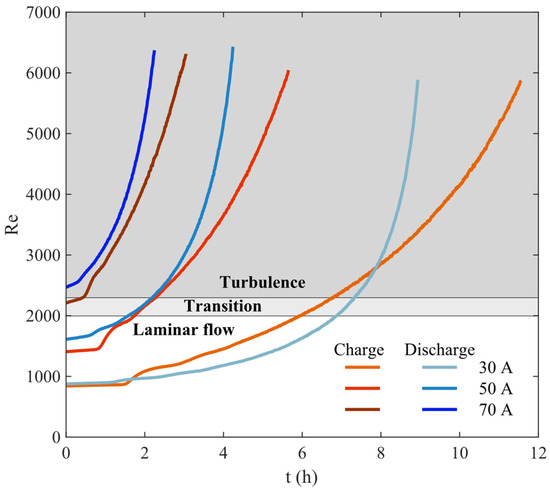 As a consequence of the deductions above, it was necessary to compute the Reynolds numbers to estimate the turbulence effect on the mixing when Q is large enough. Figure 4 shows the Reynolds number evolution in each test, also showing the laminar, transition, and turbulence regimes. The 30 A case showed a laminar flow for half of the charge/discharge, indicating that the mixing was mainly due to the natural and mixed convection. The two steps after the initial plateau occurred in the laminar region, consistently with the reduction in mixing. The 50 A case also began in the laminar region, but after 1.6 h, the discharging jet entered a transition regime and then a turbulent regime. The step after the plateau occurred while the jet was laminar and disappeared when the flow entered the turbulent regime. The 70 A case was different. During charge, the jet was very close to a turbulent regime and during discharge a turbulent flow occurred from the beginning. This produced a higher mixing, contributing to reducing the length of the plateau and eliminating steps in the OCV curve. All result in developed turbulent jets, increasing the mixing and smoothing the OCV curves, as the stack received more homogeneously charged electrolytes.