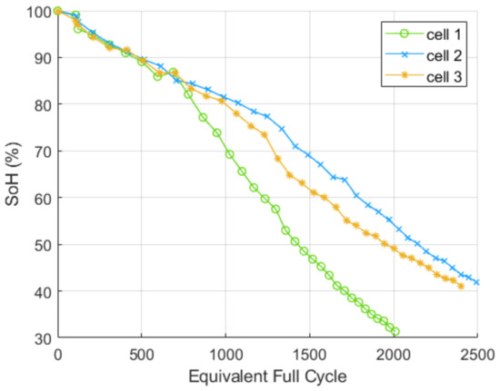 As shown in Figure 2, cell 1 experienced a linear decline in SoH during the first 700 Equivalent Full Cycles (EFC) and an acceleration of the slope after 700 EFC and 85% of SoH. Cells 2 and 3 have a similar aging pattern with an acceleration of capacity fade around 1200 FEC and 75%. Cells do not age at the same rate but undergo the same forms of aging with two slopes. The first slope corresponds to a first-life application, and it is commonly considered as LLI. One EFC corresponds to a transfer of charge equal to the cell’s nominal capacity. Subsequently, there was a marked decrease in cell capacity.