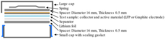 Detailed structure of a CR2032 button cell for the electrochemical characterization of electrode materials.