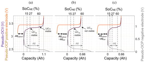 The cell’s pseudo-OCV can be reconstructed based on each electrode pseudo-OCP as presented in Figure 5a. Figure 5b,c present the impacts of the two aging scenarios that can appear in a cell: LLI and LLI + LAMNE. Their respective impacts on the negative electrode pseudo-OCP and the cell pseudo-OCV are depicted in Figure 5b,c. This reconstruction correlates the potential jumps and plateaus of the graphite electrode on the cell pseudo-Open Circuit Voltage (OCV) because of the flat profile of the pseudo-OCP of the positive electrode. The pseudo-OCP for a full-size electrode is the same as the pseudo-OCP obtained with the data collected in coin cells, taking into account a scaling factor that depends on the ratio of the surface area of the coin cell sample to that of the full cell electrode. For a fresh cell, there is an offset between the pseudo-OCVs of each electrode due to the initial formation of the SEI after cell fabrication in Figure 5. This value ΔQoffset is obtained in Section 2.2. Figure 5b displays the pseudo-OCP of both electrodes and the OCV of the cell assuming the first aging scenario with LLI only. In this case, the gap between the OCPs of the two electrodes widens. Figure 5c depicts the second aging scenario that combined aging involving both LLI and LAMNE. Here, the offset between the OCPs of the two electrodes increases in the same way as in Figure 5b. But, in Figure 5c, the spacing between the potential jumps diminishes at the same time. This is due to a shrinkage of the negative electrode pseudo-OCP. This finding is consistent with the analysis by Birkl et al. showing the impact of a drop in the quantity of exploitable graphite compared to a reference cell [18]. Depending on the aging type, certain peaks might become indiscernible in the cell’s OCV, rendering them unusable. For instance, in Figure 5b, the peak (for a state of charge of the negative electrode, SoCNE, of 60%) vanishes from the pseudo-OCV curve due to extensive aging caused by LLI.