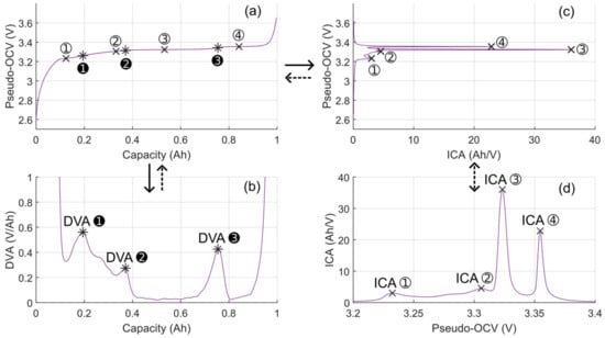 The proposed diagnosis method uses the capacity variation between pairs of peaks to estimate the electrode capacity, and finally, to estimate the electrode state of health. The electrode capacity fading due to LAMNE can be estimated thanks to the shrinking distance between the three DVA peaks, as their positions do not change with aging due to LLI. The same comment can be made for ICA; i.e., peaks ① and ②, since they do not move with the aging caused by LLI.