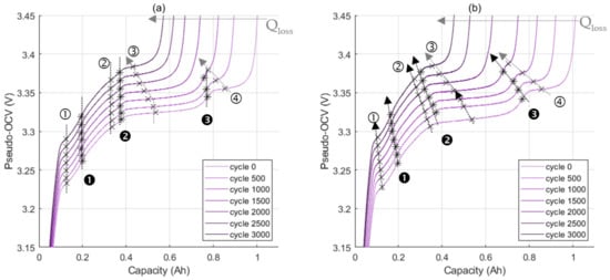 The pseudo-OCV curve shrinkage, resulting from capacity loss () depends on the aging phenomenon. Figure 7a,b represent the evolution of a cell’s pseudo-OCV (every 500 cycles) in the cases of LLI and LLI + LAMNE aging, respectively. Figure 7b is obtained from experimental data, while Figure 7a is obtained from a simulation of aging of a cell without LAMNE using pseudo-OCP curves, as shown in Figure 5a,b. An offset of 0.05 V is applied between each pseudo-OCV to improve the reading. Indeed, peaks from DVA do not move with aging instead of ICA peaks due to LLI, as illustrated in Figure 7a. ICA peaks ③ and ④ have a change of localization due to plateau shrinkage. The shift in peaks caused by the LAMNE is presented in Figure 7b, which considers combined aging (LLI and LAMNE). All the peaks move the capacity of the negative electrode: a lower charged capacity between each peak is correlated to a lower lithiation or delithiation of the electrode for the same change in the electrode state of charge. Values are listed in Table 1. These values are based on the measurements of the negative electrode in Figure 4a.