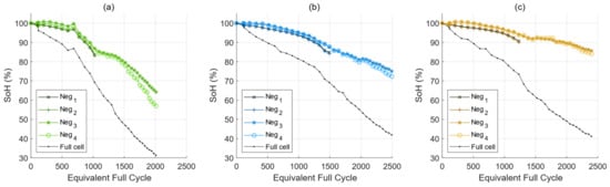 Cells’ SoH are shown in black. Evaluation of the SoHNE during cycling for (a) cells 1, (b) cell 2, and (c) cell 3 using estimators Neg1, Neg2, Neg3, and Neg4.