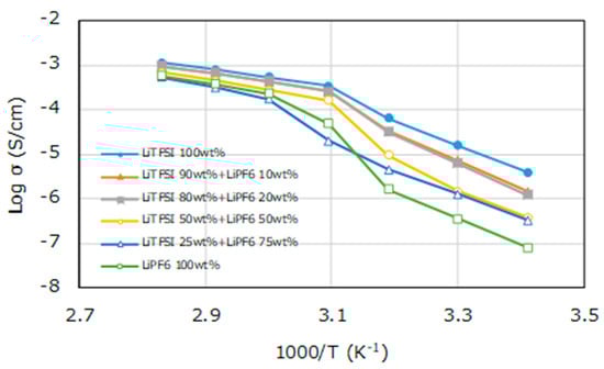Figure 1 shows Arrhenius plots for the electrical conductivity of PEO18 (100-x)LiTFSI-xLiPF6 as a function of x (wt%), where the subscript 18 indicates a PEO-to-Li salt ratio of Li/O = 1/18. The conductivity inflection around 60–50 °C reflects the transition from the crystalline to amorphous phase at the eutectic temperature [,]. The conductivity decreased with an increase in the LiPF6 content, both in the high- and low-temperature region, although the decrease was stronger in the crystalline phase region. The transition temperature increased with the LiPF6 content. (PF6)− anions, which are smaller than (TFSI)− anions, attract Li+ ions more strongly to themselves, which could decrease both the volume fraction of the amorphous phase of the PEO–salt complex and the number of charge carriers due to the low degree of ion dissociation []. The conductivities at 80 °C ranged from 1.15 × 10−3 S/cm for 0% LiPF6 to 0.58 × 10−3 S/cm for 100% LiPF6, and those at 60 °C were from 0.54 × 10−3 S/cm for 0% LiPF6 to 0.23 × 10−3 S/cm for 100% LiPF6. The conductivities at 80 °C are considered acceptable for an SPE for battery operation; however, at the working temperature of 60 °C, the conductivities for the LiPF6-rich region may be too low for high-rate cycle testing. Therefore, all the electrochemical measurements were performed at 80 °C.