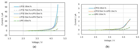 At the beginning, the decomposition potentials (electrochemical stability window) and the aluminum dissolution potential of the polymer electrolytes were evaluated from CV measurements of the Li/electrolyte/Au and Li/electrolyte/Al cells. Figure 2 shows potential sweep results from 2.5 V to 5.0 V vs. Li/Li+ in the second cycle at 80 °C. In the first oxidation sweep, small irregular peaks appeared, which disappeared after the second cycle, and the CV curves became stable with similar curves after the second cycle. Although it is difficult to estimate the decomposition potential for each electrolyte from Figure 2a, the smaller current with a higher content of LiPF6 indicates that the presence of LiPF6 increases the resistance of the electrolyte against oxidative decomposition (and/or oxidative reactions with Au metal). The aluminum current collector has been known to undergo noticeable corrosion in carbonate-based electrolyte solutions containing LiTFSI [,]. However, in the case of the SPE containing LiTFSI, no significant corrosion in contact with the passive layer of Al occurred, as shown in Figure 2b, where only a small current (one tenth of that in the Au electrode) flowed at 5 V vs. Li/Li+ in the repeated CV measurements. The SPEs tested showed larger stability windows at the Al surface than at the Au surface, and in both cases, the addition of LiPF6 to LiTFSI was effective to expand the stability window by forming a protective film. Therefore, in the following discussion, the possibility of a reaction between the SPE and the Al sheet is not considered (although the gradual reaction for a long period may be left uncertain).