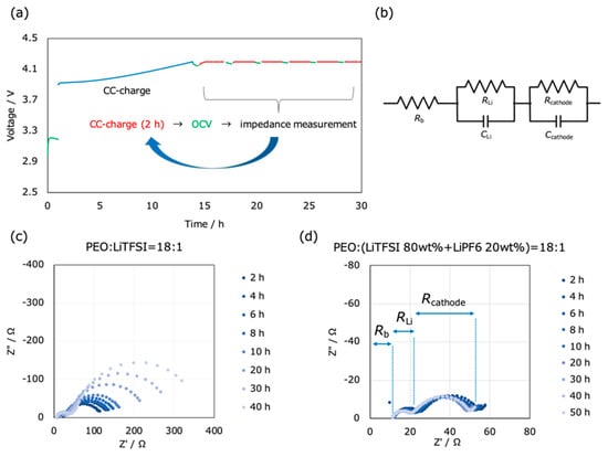 (a) Schematic pattern of the impedance measurement combined with constant current-constant voltage charging. In this example, the cell was charged to 4.2 V vs. Li/Li+ by constant current, maintained for 2 h at the voltage (constant voltage charge), and open-circuited, and then, the impedance was measured. The process was repeated 20 times. (b) Assumed equivalent circuit. (c) Time dependence of the impedance spectra for the Li/PEO(LiTFSI 100 wt%)/LiCoO2 cell at 4.2 V vs. Li/Li+. (d) Time dependence of the impedance spectra for the Li/PEO(LiTFSI 80 wt%+LiPF6 20 wt%)/LiCoO2 cell at 4.2 V vs. Li/Li+.