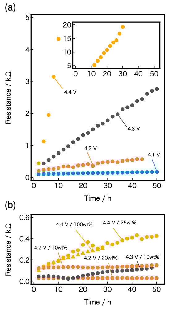 To evaluate the stability of the SPE with the LiCoO2 cathode material under static conditions, AC impedance measurements were performed under each potential of the Li-deintercalated Li1−xCoO2 electrode by the combination of constant current–constant voltage charging processes. The cells were charged to 4.1 V, 4.2 V, 4.3 V, and 4.4 V vs. Li/Li+ with the voltage maintained for 2 h and then open-circuited for 2 h followed by the impedance measurements (from 1 × 106 to 0.05 Hz) using a multi-potentiostat with an impedance analyzer (Biologic VMP3). The measurements were repeated 20 times to observe the variation in the interface resistance with time. All measurements were performed at 80 °C.