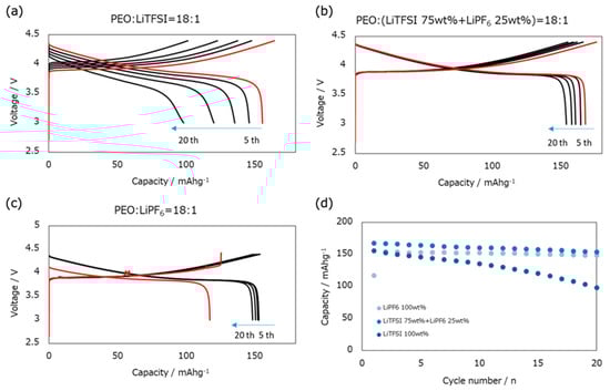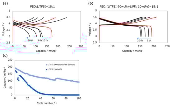 Charge–discharge curves for (a) Li/PEO-LiTFSI/LiCoO2 and (b) Li/PEO-LiPF6/LiCoO2 cells, and (c) the cycle performance. The red lines in (a,b) show the first charge-discharge curves. The cut-off voltage was 2.5–4.5 V with a rate of 0.1 C at 80 °C.