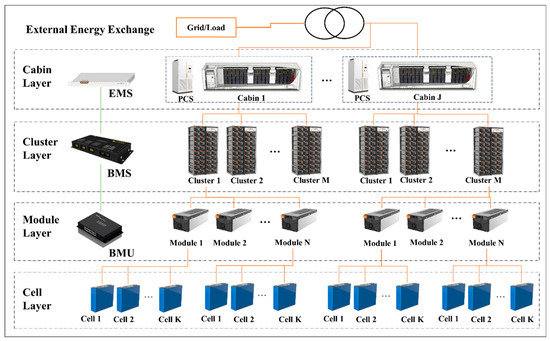 Battery energy storage systems (BESSs) with varying capacities consist of several battery modules or clusters, each made up of multiple modules that further comprise individual cells [1]. Large-scale energy storage stations are usually equipped with numerous battery cabins corresponding to the installed capacity, and each battery cabin is formed by multiple clusters. The typical topology is illustrated in Figure 1.