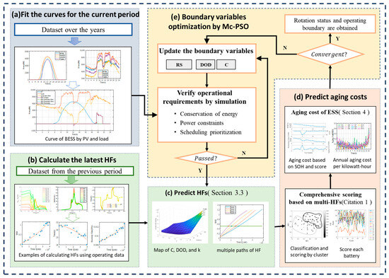 (a) A period of time with similar conditions is defined as a study period. (b) Input data collected over this period across multiple years are utilized to create a typical dispatching curve with the latest data gathered, through a fitting process. (c) By employing boundary parameters that ensure effective responses to dispatching instructions, multiple HFs are predicted at the end of an operational period. (d) Subsequently, a comprehensive score is calculated to evaluate aging costs. (e) The Mc-PSO algorithm is then utilized to adjust control variables until operating boundaries are identified that lead to the lowest aging cost.