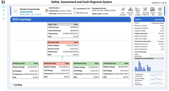 At the end of each operational period, actual data are imported into the battery fault diagnosis system (BFDS) specially developed for energy storage stations, as shown in Figure 4. The author’s team spent over two years developing the platform, which integrates multiple functional modules for energy storage stations such as operational data preprocessing, fault diagnosis, health assessment, and inconsistency analysis. BFDS extracts real HFs as input for a new period and identifies any safety concerns based on these HFs. Any safety concerns identified lead to the suspension of control to initiate the inspection and maintenance process.