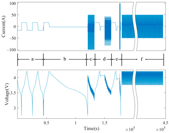 The battery operation for one cycle is shown in Figure 7, where the areas a–e indicate the performance evaluation, including capacity, low-rate discharge, dynamic stress test (DST), Federal Urban Driving Schedule (FUDS), and hybrid pulse power characterization (HPPC), respectively, and f indicates the cyclic aging.