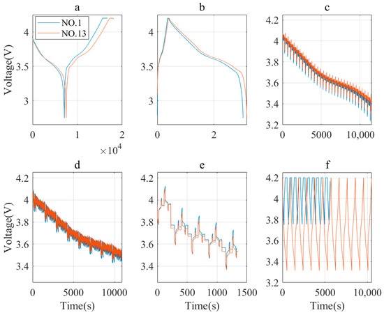Figure 8. Items within a test cycle for No. 1 and No. 13 battery: (a) capacity; (b) low-rate discharge; (c) DST; (d) FUDS; (e) HPPC; (f) aging cycles. - Low-current discharge curve: Charge the batteries at a current of 1/3C to the cut-off voltage and discharge them at a current of C/20 to 2.75 V after standing, as shown in Figure 8b.