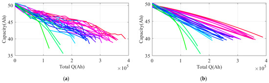 (a) Aging curves of all batteries between capacity and cumulative throughput quantity (Total Q); (b) aging curves of all batteries after polynomial fitting.