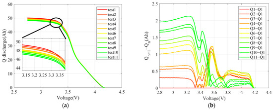 Figure 10. Calculation process of VAR: (a) original V-Q curve; (b) discharge difference curve based on test 1.
