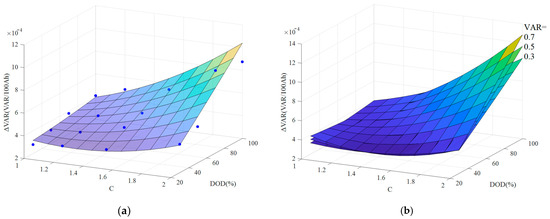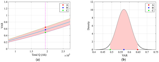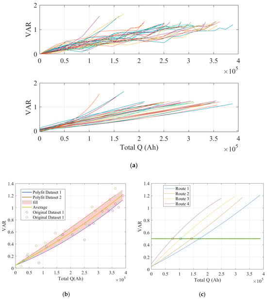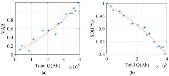 Figure 11. Strong correlation between VAR and SOH: (a) scatter plot and fitting curve of VAR; (b) scatter plot and fitting curve of SOH. - Resistance. The ohmic and polarization internal resistances can be calculated through the HPPC test according to the literature [54]. Refer to Figure 12a and Formula (8). Figure 12b displays the HPPC curves for multiple tests of No. 1 battery, illustrating that voltage changes intensify under the same current excitation with aging progression. Figure 13 shows the change curves of ohmic and polarization internal resistances.