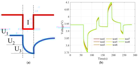 - HPPC: Perform tests at varying SOC levels [28]. After the batteries are fully charged, gradually discharge them to 80%, 60%, 50%, 40%, and 20% SOC for evaluations. Specifically, discharge them at a current of 2C for 18 s, after setting them aside to stand for 40 s, charge them at 1C for 10 s, and then set them aside again to stand for 40 s. Then charge the batteries with a current of 2C for 18 s, after setting them aside to stand for 40 s, discharge them at a current of 1C for 10 s, and finally set them aside to stand for 40 s. Refer to Figure 8e.