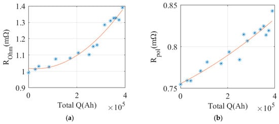 Figure 13. Resistance: (a) scatter plot and fitting curve of ohmic resistance; (b) scatter plot and fitting curve of polarization resistance.
