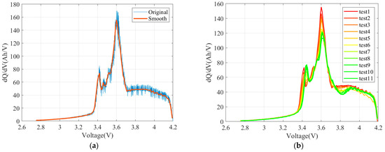 - ICA. Figure 14a shows the original IC curve of a single test, subjected to smoothing. Figure 14b shows the IC curves of multiple tests, indicating decreasing peak values, rightward shifting peak positions, and narrowed peak areas with aging progression. Figure 15 shows the variation curves of peak values and peak areas, respectively.