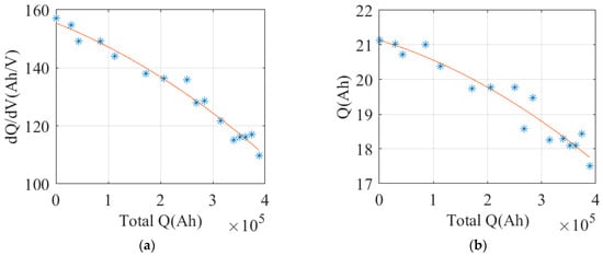 Figure 15. IC features: (a) scatter plot and fitting curve of peak value; (b) scatter plot and fitting curve of peak area. - 4.