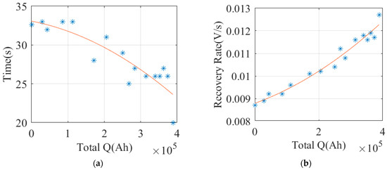 Figure 17. Relaxation features: (a) scatter plot and fitting curve of recovery time; (b) scatter plot and fitting curve of maximum recovery slope.