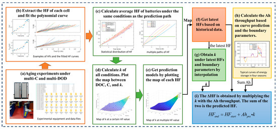 A prediction method is proposed, which integrates modeling based on experimental data to generate the aging rates of HFs along their respective paths, and incorporates the projection of cumulative throughput quantity for predicting HF values in the end-of-period phase. The main idea is shown in Figure 18.