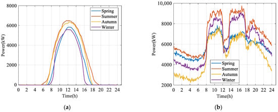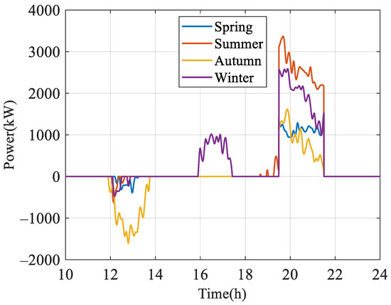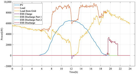 where denotes the power generation from renewable energy sources (RESs); denotes the power consumption of loads from a direct RES supply; denotes the power energy of the energy storage system by charge from the grid; denotes the battery discharge efficiency; and denotes the power supply from batteries to loads.