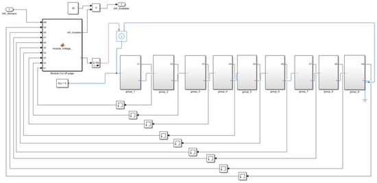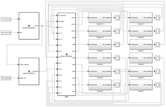 Many scholars have studied control strategies for mitigating aging under power system scenarios. Zhao et al. [8] established the semi-empirical life model of the battery based on throughput, state of charge (SOC), and injected/output power of a BESS, applied to an aging rate equalization strategy for microgrid-scale battery energy storage systems. Xu et al. [9] developed a mapping relationship between system capacity losses and aging costs to optimize and support dispatching in the service market, ultimately boosting profits and prolonging battery longevity. However, energy storage systems were considered as a whole in the majority of previous research, primarily due to the unavailability of separate control over battery clusters/modules. In the traditional topological structure shown in the cabin layer of Figure 1, one power conversion system (PCS) corresponds to one battery cabin, where power is simply distributed to clusters and modules in an equalized manner. Ci et al. [10] proposed the dynamic reconfigurable battery energy storage technology. Han et al. [11] provides an overview of a next-generation battery management system (BMS) featuring dynamic reconfiguration. In comparison to the conventional norm of fixed series–parallel connections, the DRB networks use new program-controlled connections between battery cells/modules.