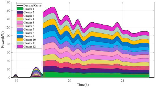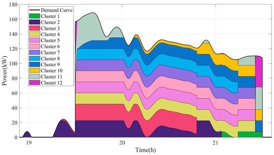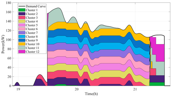 Obviously, the proposed differentiated method is superior to the traditional equalized strategy, with a longer life, lower aging cost, and better consistency. Because the particle population of the Ldw_PSO is not diverse enough, it may sometimes be easy to fall into the local optimal solution. In the subsequent analysis, we mainly compare differentiated dispatching strategy with Mc_PSO and equalized dispatching strategy. The first round of the solving process is meticulously outlined. Figure 33 presents a comparison of aging curves among the 12 clusters under the proposed method. These clusters using the proposed method halt in responding in summer with peak demands, after a nine-and-a-half-year operational duration, due to serious aging, as shown in Figure 34. With DOD and C constraints removed in summer, the clusters continue to operate with equalized distribution, yielding identical operating curves as shown in Figure 32. Furthermore, the differentiated dispatching strategy is sustained in other seasons, as exemplified in the winter operation shown in Figure 35. In the first quarter of the 14th year, cluster 1 is decommissioned but the remaining 11 clusters remain available in responding to instructions. In the next quarter, with the decommissioning of cluster 6, the battery cabin becomes incapable of responding to dispatching instructions, signaling its end-of-life stage.