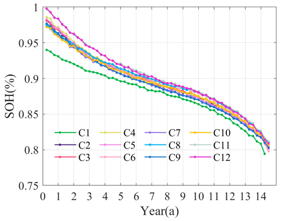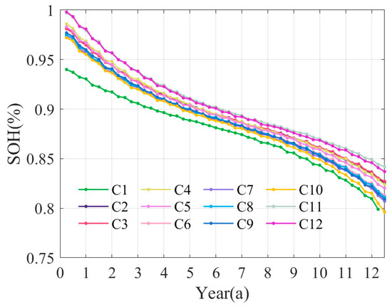 Figure 37 shows the aging curves of the 12 clusters under the equalized method. When a cluster with inferior performance is disconnected upon reaching the cut-off voltage, power is redistributed equally among the others. Cluster 1 is decommissioned after the first quarter of the 12th year, followed by cluster 10 in the next quarter. Although the other batteries remain in good health, the cabin can no longer respond to instructions, as shown in Figure 38. Compared with the differential strategy in Figure 33, the life of high-performance batteries in early operation is sacrificed, resulting in an increase in the downward slope of their life curves. However, the overall result is that the aging rates are not the same; nevertheless, the aim is to achieve the convergence of the aging curves, and finally obtain balanced aging curves.