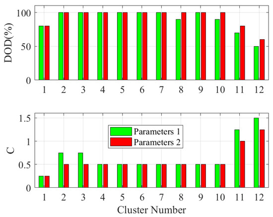 and operating boundaries are the variables to be optimized. However, each battery cluster covers the whole optional range, resulting in an intricate solving process. To reduce the solving difficulty and control complexity, the following two methods are applied for simplification. The first method involves taking C-rate values as 0.25, 0.5, …, 1.75 and 2, and the DOD as discrete points of 20%, 30%, …, 100%, to simplify the solution domain space dimensionality. The second method is to introduce a new variable, Rotation Status, in operation to preliminarily define the range of boundary parameters and narrow the search scope. RS includes stable operation (S), dynamic operation (D), and emergency operation (E). Each rotation status imposes specific constraints on the maximum values of the operating boundaries, as outlined in Table 1.